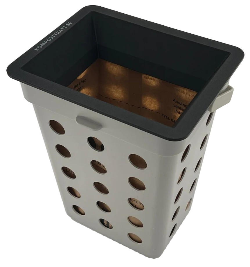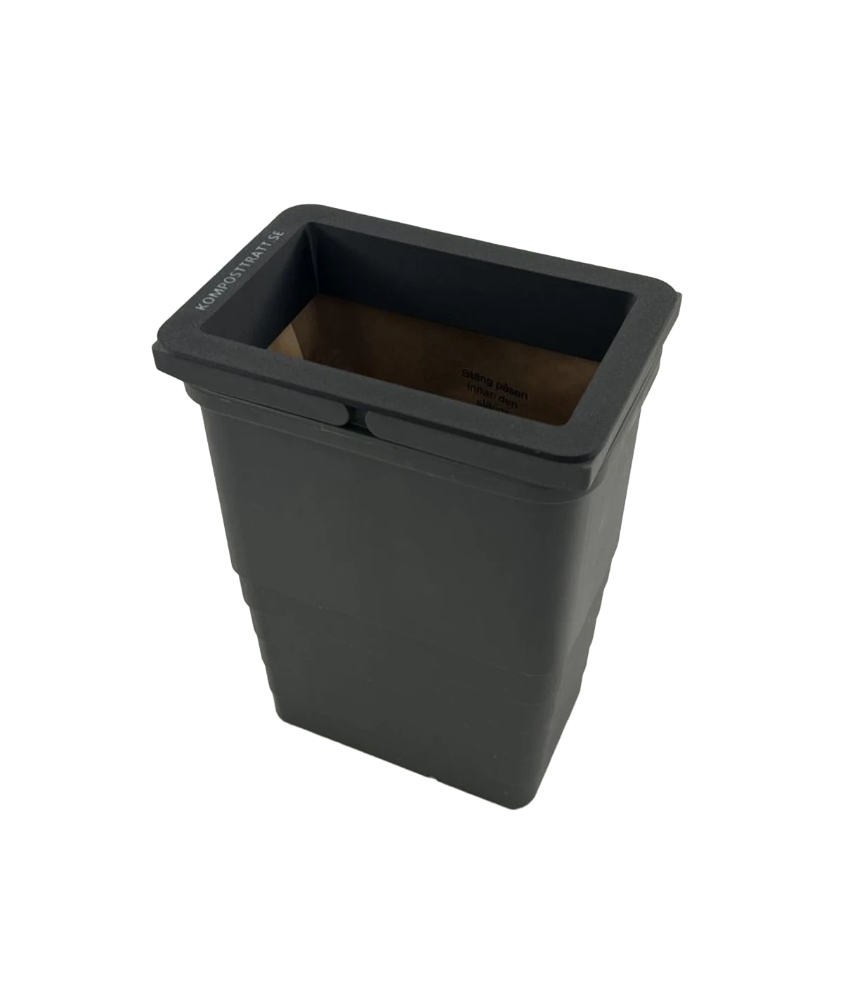 Denna komposttratt passar kärl med innermått om 193×119 mm och påsar vars öppning är större än 18,2 x 12,8 mm.